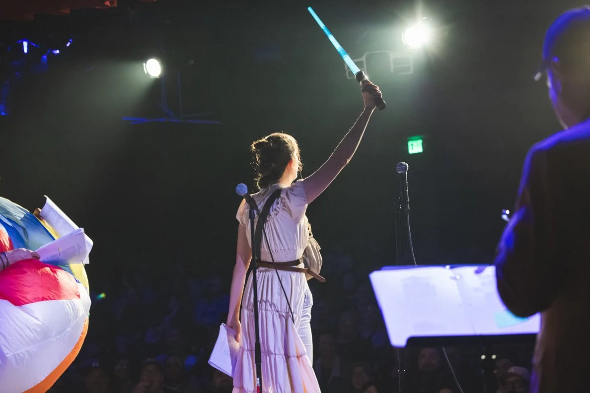On January 10, Dynasty Typewriter hosted The Moof-milkers, an all-star live reading of the original Star Wars: Episode VII – The Force Awakens screenplay. Presented by the Star Wars Minute Podcast and The George Lucas Talk Show, the night featured a truly stacked cast including Alex Robinson, Alex Song‑Xia, Alison Rich, Dana Gould (as Dr. Zaius), Daphne Zuniga, David Dastmalchian, Eric Edelstein, Gil Ozeri, Hal Lublin, JoJo Ginn, Kevin Smith, Laraine Newman, Lou Wilson, Mike Mitchell, Patrick Cotnoir, Pete the Retailer, Taran Killam, Vic Michaelis, Wil Wheaton, and more. With a packed house, deep-cut fandom energy, and wildly committed performances, the evening turned a familiar script into something fast, chaotic, and genuinely hilarious—a fully unhinged celebration of Star Wars on stage.